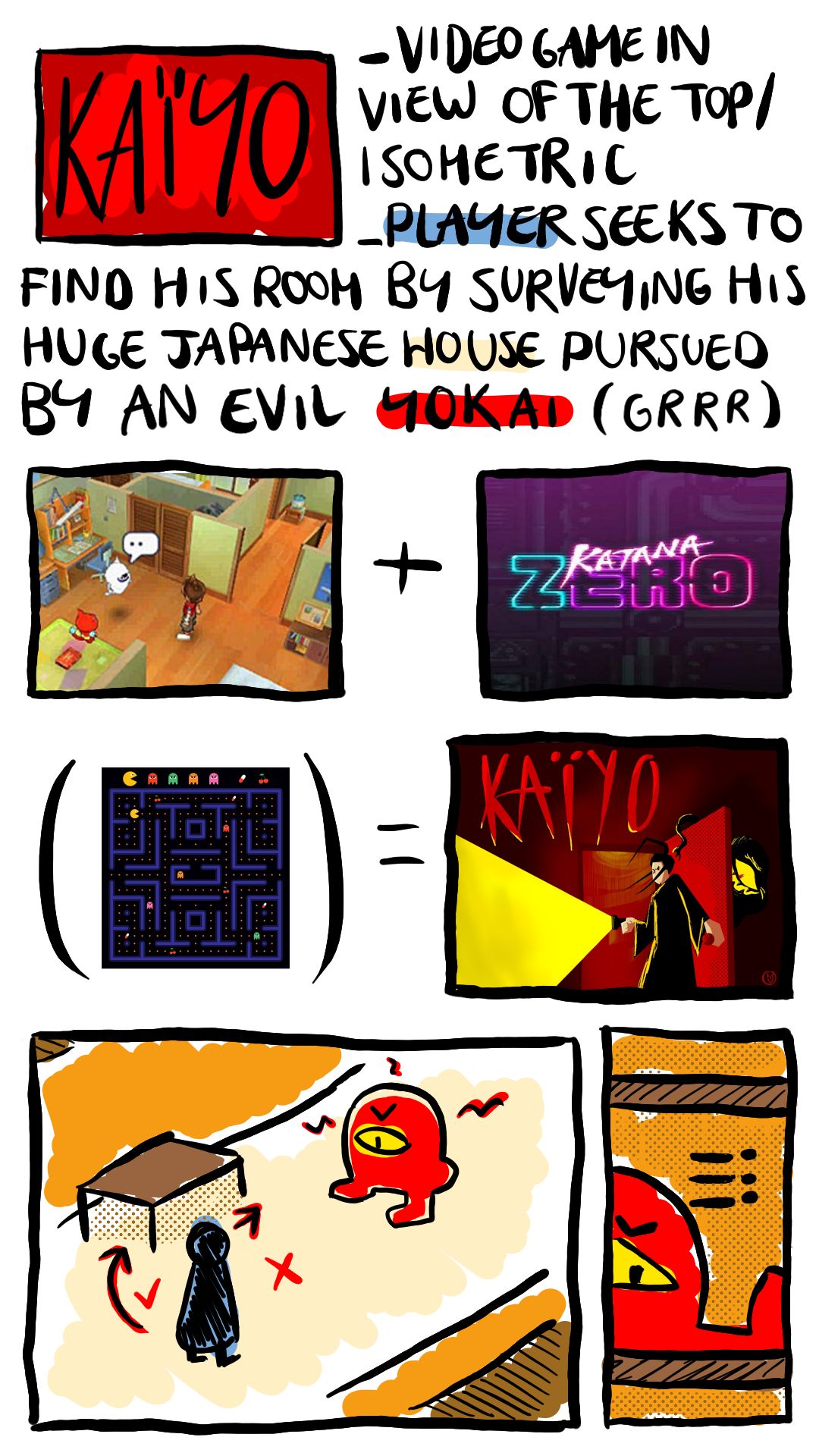 Première ébauche de mon jeu "Kaiyo". Je mentionne mes inspirations en terme de gameplay/ style graphique : ici les jeux "Yokai-Watch", "Katana Zero" et "Pac-Man".